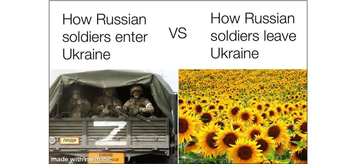 Conceptual templates (memetic ideas/concepts). A two-dimensional meme can be built on a conceptual template if it uses a viral idea or a folkloric story that is part of the popular narrative but has not been encapsulated in a single word or phrase. Some examples of these viral ideas/concepts in memes of the Russo-Ukrainian War are sunflowers growing on graves of Russian soldiers, Kherson watermelons to be tasted after the liberation of Kherson, Ukrainian dogs, foxes and other animals getting fatter as a result of eating enemy corpses, Ukrainian farmers stealing tanks and old ladies downing drones with a jar of pickles, Ukrainian birds and mosquitos fulfilling combat missions, Ukrainians offering eggs instead of rare earth minerals to Americans, Putin’s weakness for historical excurses, and many others. Each of these narratives originated at a specific (and often documented) point in time, became widely popular, and was propagated in various modes, including digital images and videos.