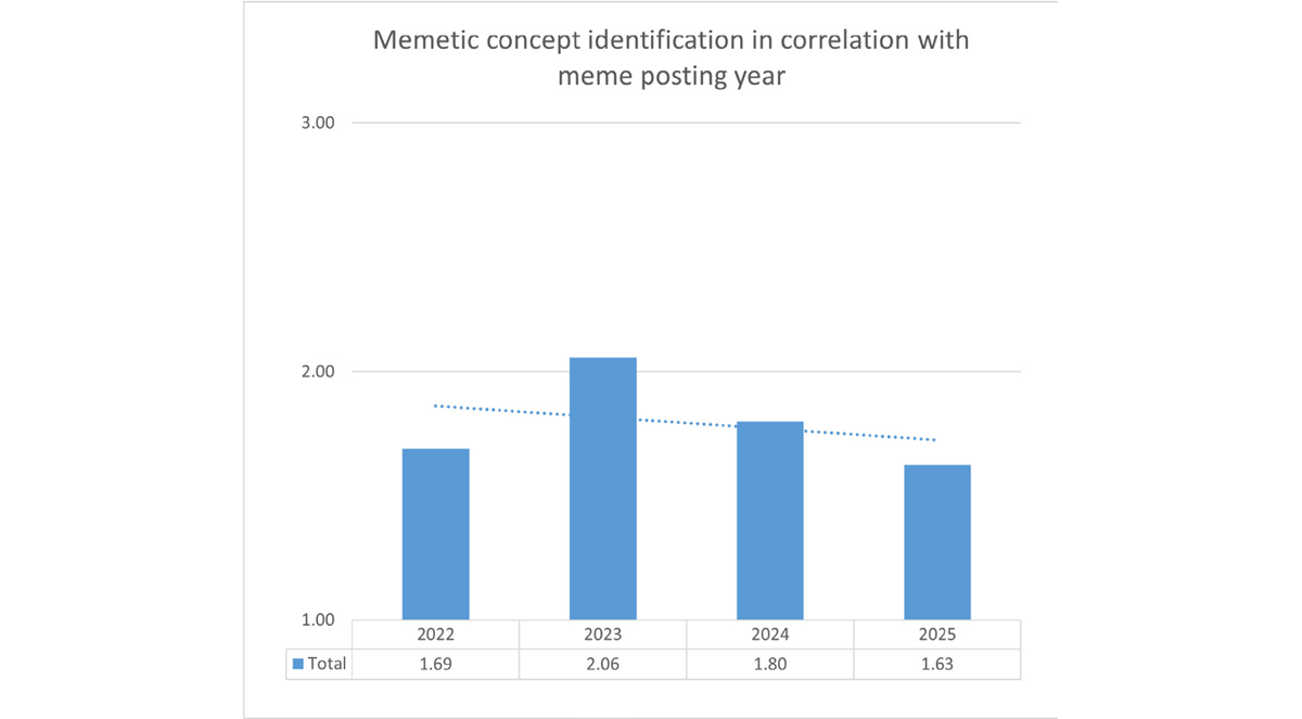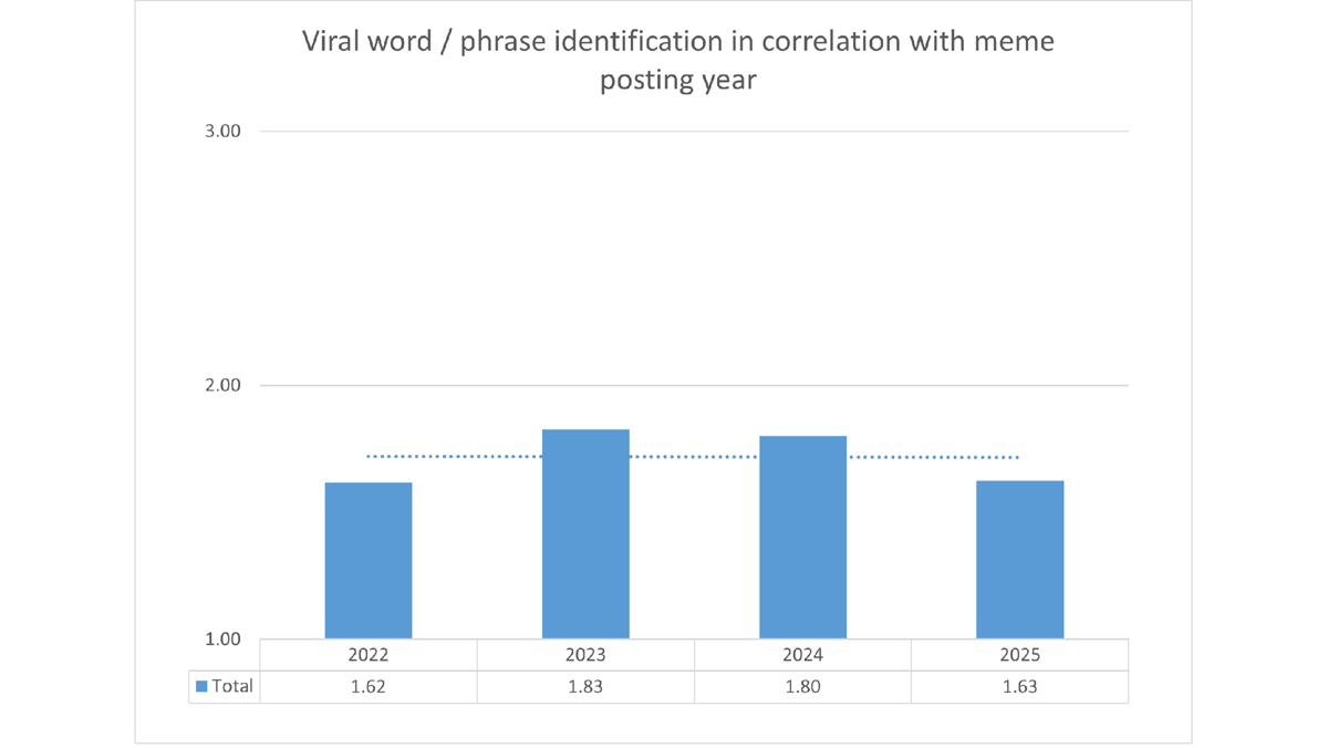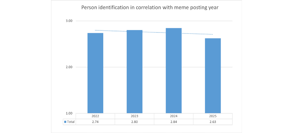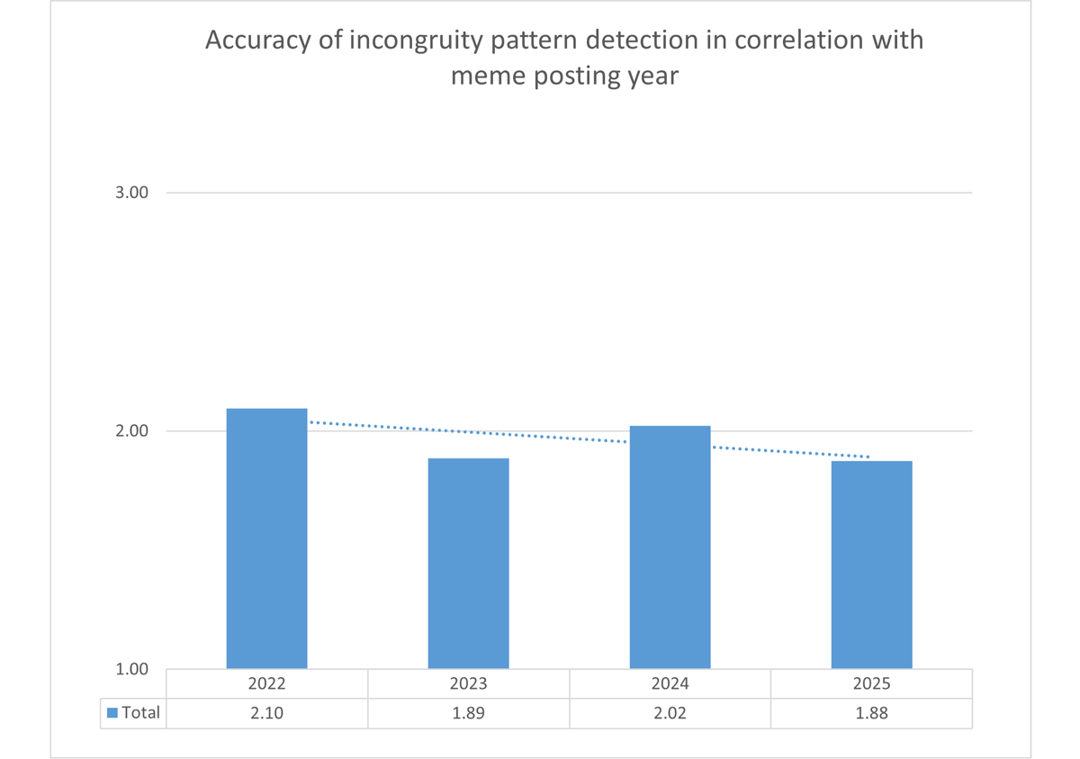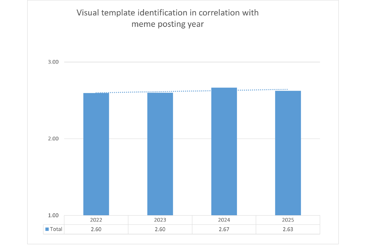 Success in identifying verbal templates increased in 2023 and 2024, whereas performance for memes posted in 2022 and 2025 was lower (Figure 11).
