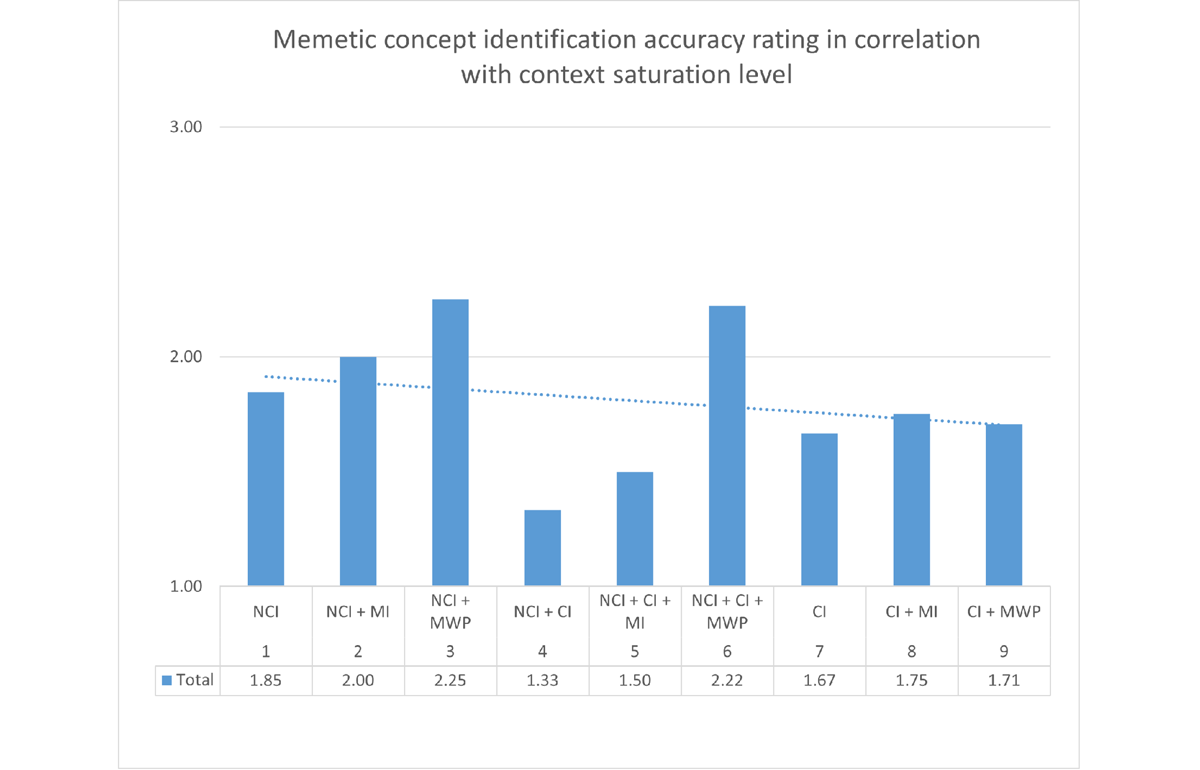 To measure the amount of context in memes, we rated the combinations of visual, verbal, and conceptual templates in the memes by the degree of context saturation (CS) they contain (Table 1). By CS, we understand the perceived amount of contextual information embedded in a meme’s structural elements. Three groups of context saturation patterns emerged around three basic types of visual templates: non-contextual image (NCI), contextual image (CI), and a combination of the two (NCI + CI), to which a memetic idea (MI) or a memetic word/phrase (MWP) can be added. Although theoretically one could expect options that would combine MI and MWP, our material did not reveal such instances. We can speculate that the reason MI and MWP do not (or possibly, rarely) coexist in one meme might be the fact that MIs and MWPs describe different concepts (in other words, they are mutually exclusive) and memes present highly focused messages that usually mention one such concept. However, this theory needs further exploration using a larger meme sample.