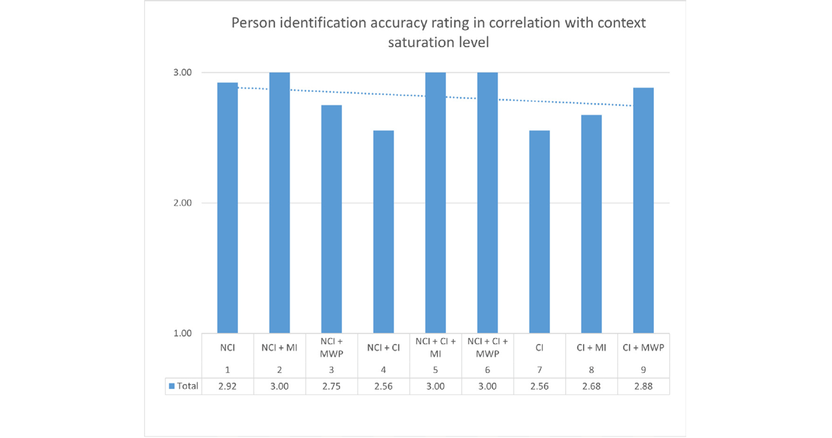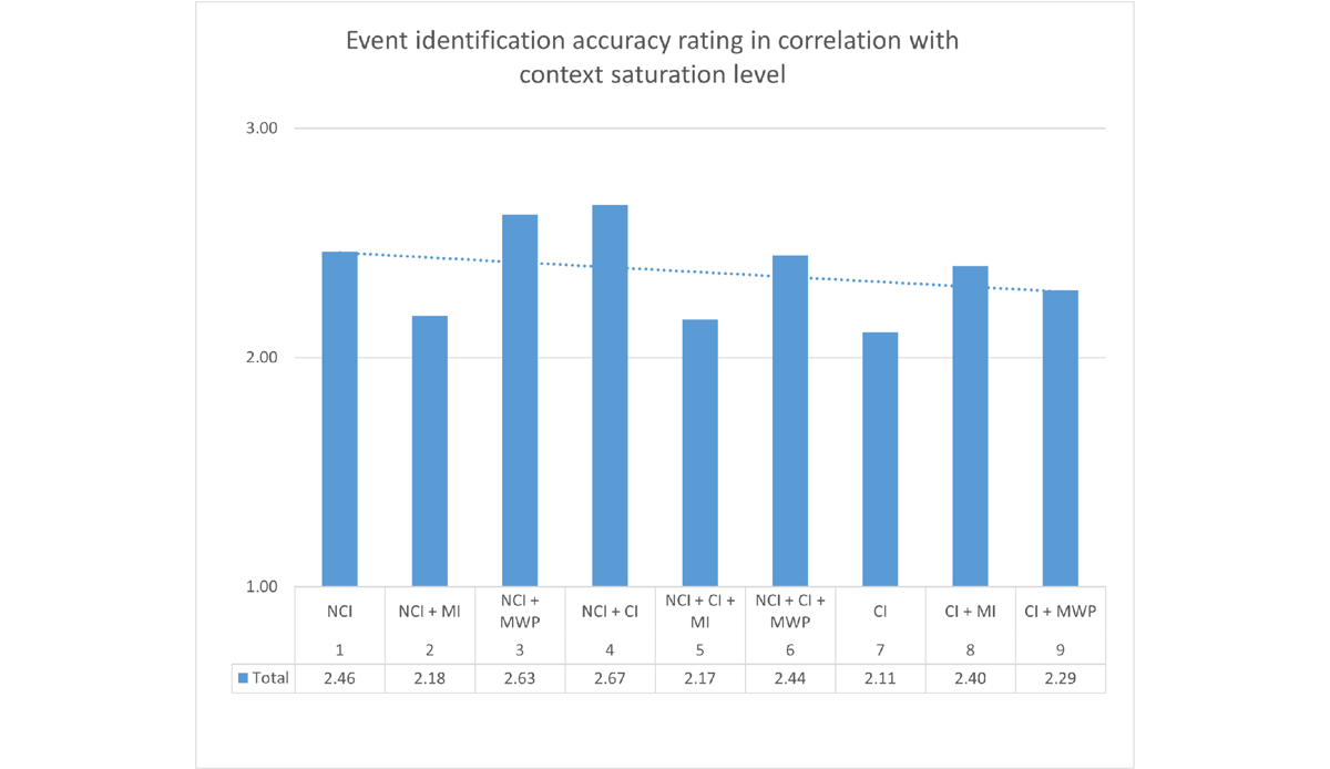 The overall event identification accuracy was lower in the higher, context-heavy end of the CS spectrum (Figure 14). In memes built on a non-contextual image or a combination of contextual and non-contextual images, the presence of a memetic idea appears to have a negative effect on the score. In contrast, for the contextual image memes, that effect was positive.