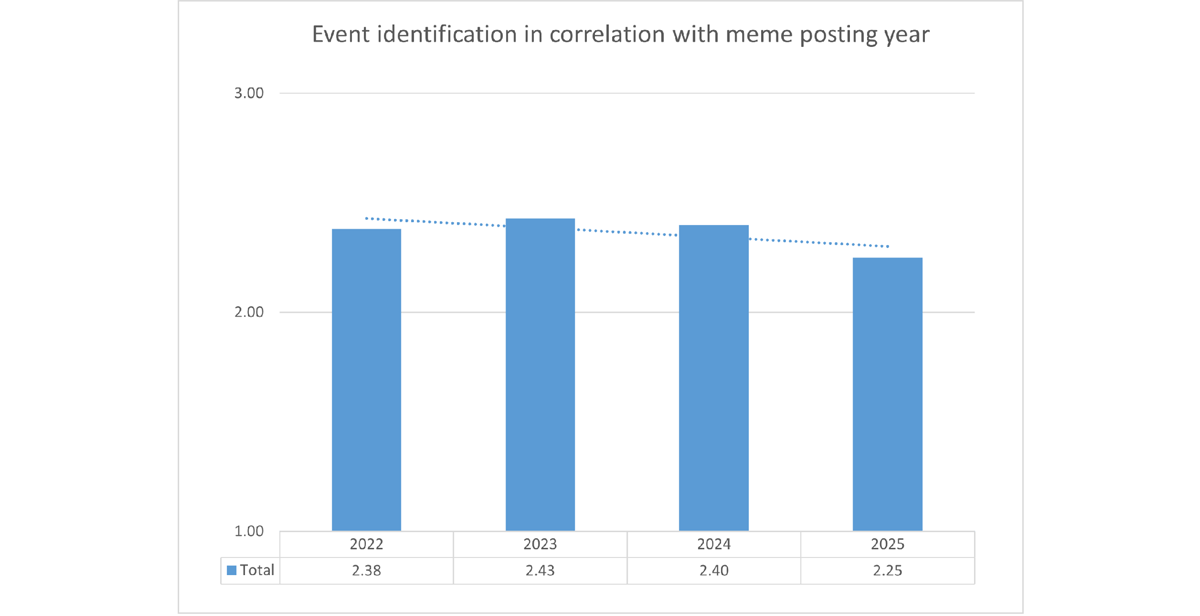 ChatGPT showed relatively even performance in event identification accuracy from 2022 to 2024, with a decline for 2025 memes (Figure 15).