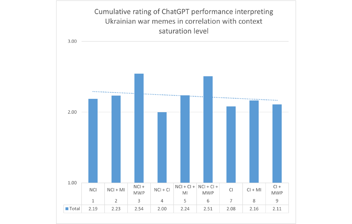 Overall, the test confirmed our hypothesis that memes from the lower end of the CS spectrum will be the easiest for the chatbot to understand (Figure 5). The highest degree of accuracy was demonstrated in processing memes built on non-contextual images. The lowest score was earned for interpreting memes built on a combination of non-contextual and contextual images. At the same time, the presence of additional contextual elements (a memetic idea or a memetic word or phrase) yielded better results.