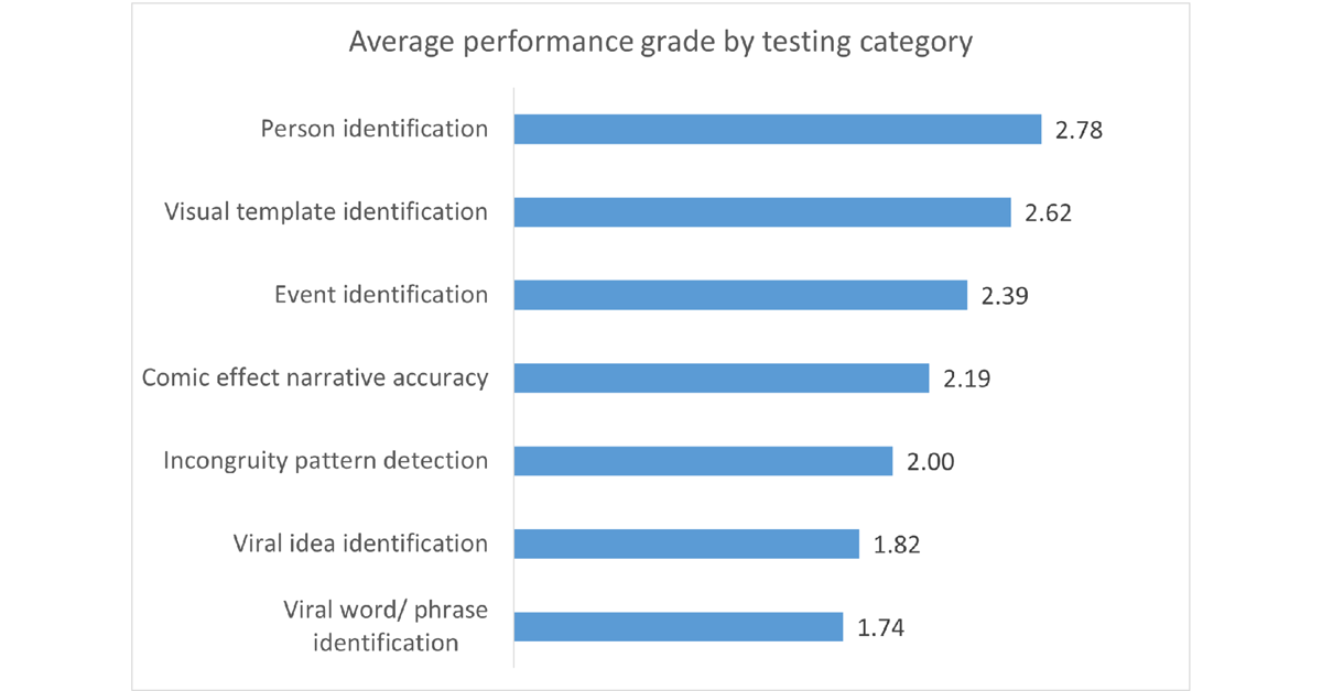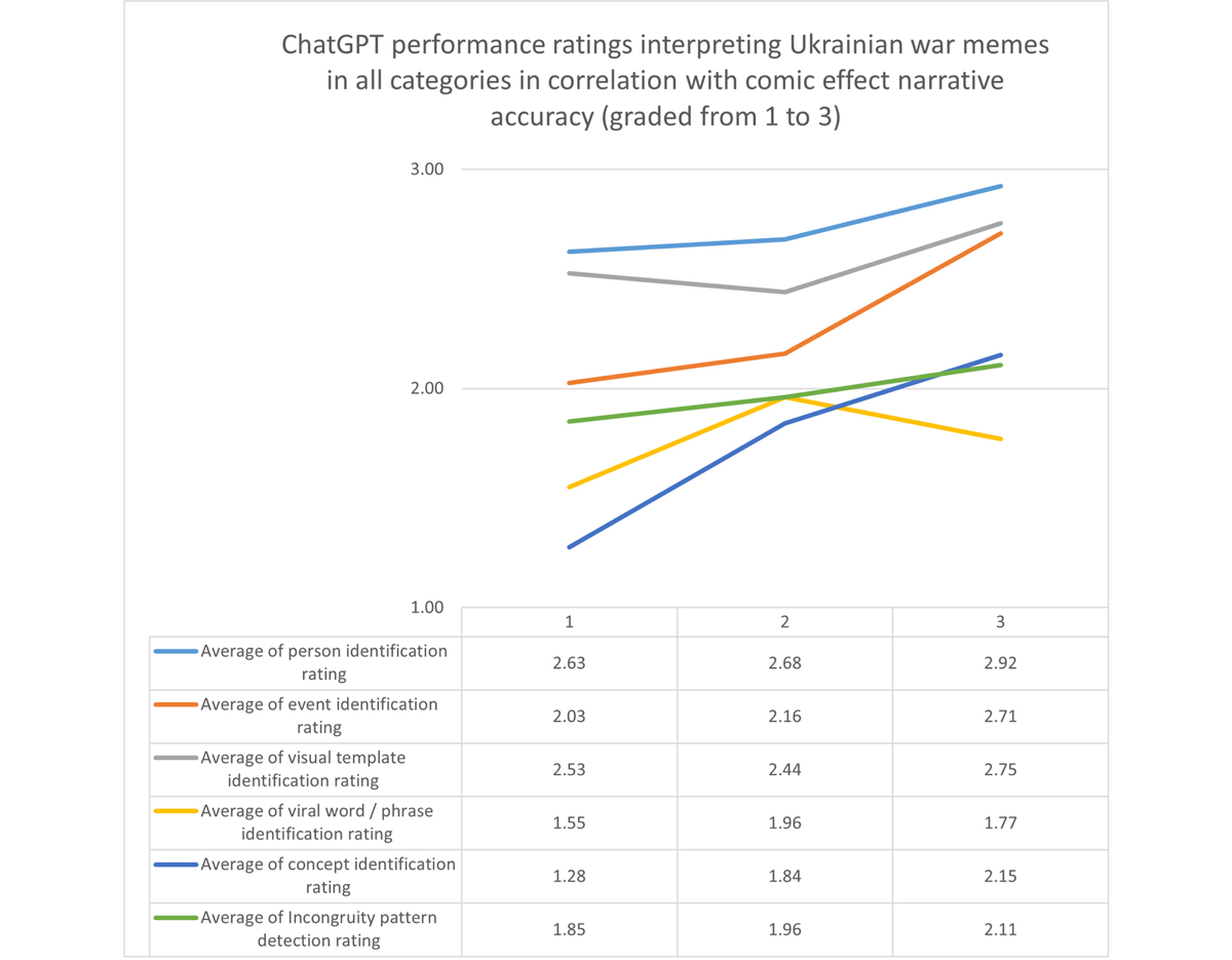 When average performance scores in each category are compared, the data shows that ChatGPT performed best in identifying the two tangible context-based elements of the meme: persons featured (average score 2.78 out of 3) and visual templates used (2.62, Figure 19). Both of these elements are often presented explicitly and require primarily visual processing. More abstract elements were identified with greater difficulty, ranging from events or news items referred to in a meme (2.32) to viral words/phrases used in a meme (1.74). The verbal templates emerged as the most challenging element for ChatGPT to analyze. In the next stage of this research, it would be reasonable to attempt to improve the Chatbot’s performance by presenting it with sets of verbal and cultural references. The present study was designed to test the Chatbot’s raw ability to identify them.