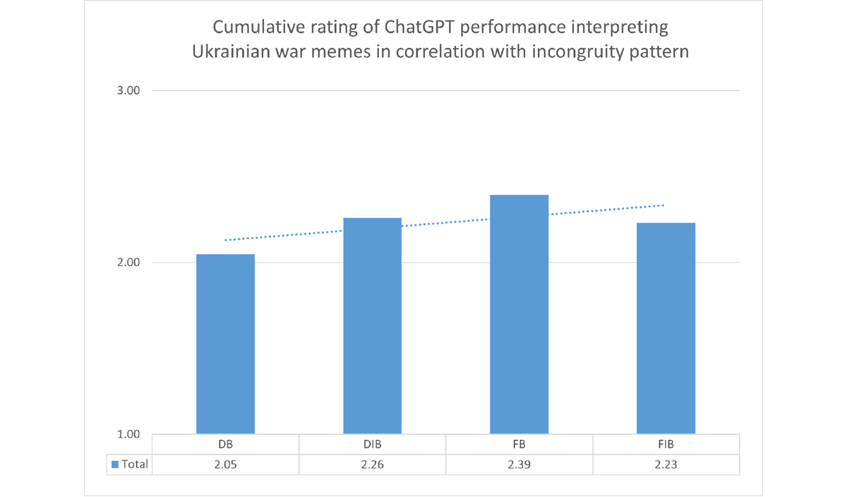 We also compared the overall performance rating across the four incongruity patterns: frame, discourse, image-frame, or discourse-image based (coded, respectively, FB, DB, FIB, and DIB). The results (Figure 20) show that frame-based memes are the easiest for Chat to interpret (average score 2.39), and discourse-based ones are the most difficult (2.05). It appears that adding an image as an incongruity-forming element improves the bot’s understanding of both the discourse-based and the frame-based memes’ humor. This is consistent with the Chatbot’s demonstrated overall difficulty in interpreting verbal references.