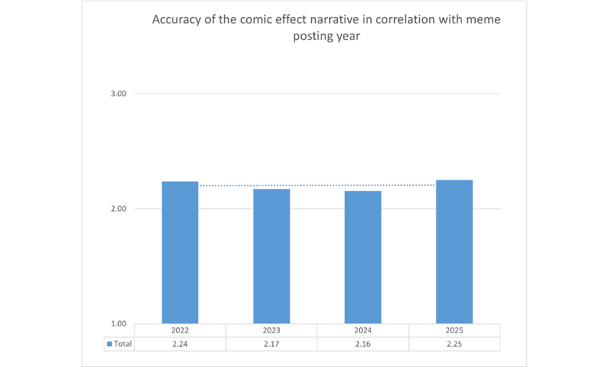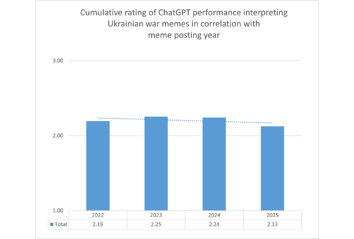 Our study also had a diachronic aspect: we were interested in how well AI would analyze the material from 2022 through 2025 retrospectively. Evaluating the ability of ChatGPT to analyze retrospective information accurately is a very important aspect of testing because retaining information over time is pivotal for the archival processing of memes in their afterlife. We hypothesized that ChatGPT acquires information gradually, retains it, and performs equally well analyzing both older and newer material.