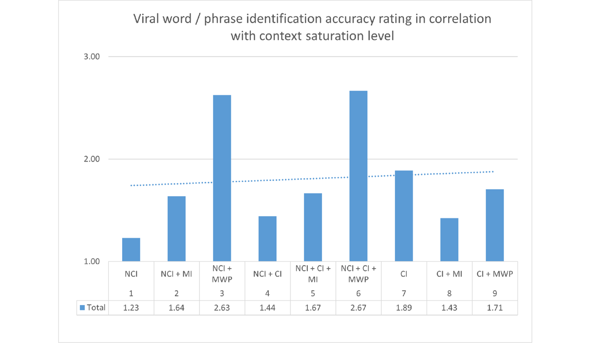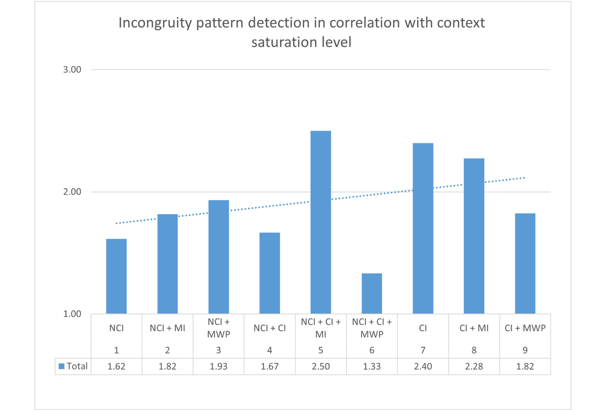 The correlation between the accuracy of incongruity pattern identification and the meme’s CS level (Figure 3), despite the overall upward trend toward the higher saturation end of the spectrum, is very uneven, especially in the middle section of the spectrum, where we find both the highest and the lowest scores for the most complex, tripartite template categories (NCI + CI + MI and NCI + CI + MWP, respectively). The addition of memetic ideas and verbal memes appears to have enhanced the processing of non-contextual-image memes, but hindered it for memes utilizing a contextual image as a visual template.