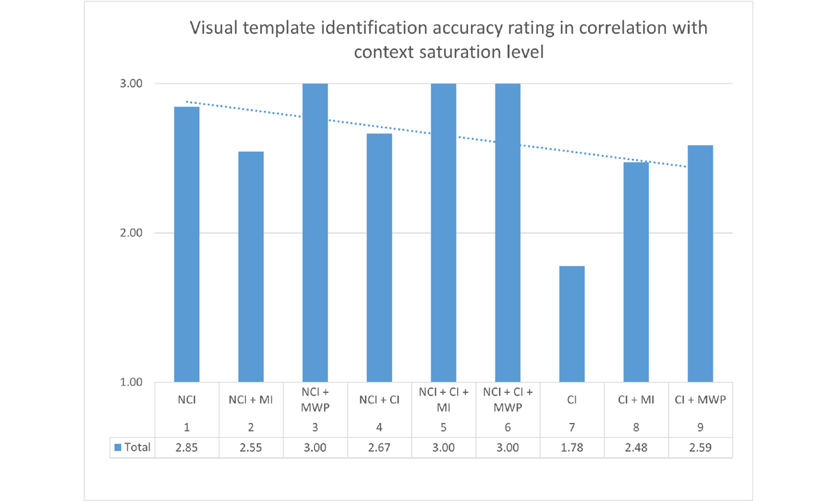 On the CS spectrum, overall performance declines towards the highest end (Figure 7). Identifying visual templates in contextual image-based memes was predictably the most challenging task in this test. A combination of non-contextual and contextual images, on the other hand (the CS spectrum’s middle segment), created conditions in which Chatbot showed the strongest performance, with both of the tripartite template categories (NCI + CI + MI and NCI + CI + MWP) consistently rated at 3.